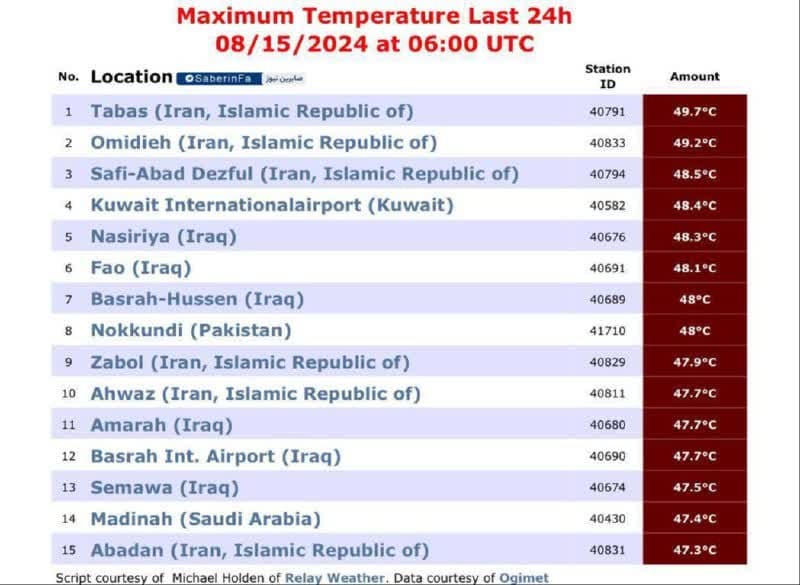 بر اساس داده‌های سرویس خدمات آب و هوایی OGIMET در شبانه‌روز گذشته زابل در شمال سیستان و بلوچستان با دمای 47.9 درجه سلیسوس و اهواز و آبادان به ترتیب با ثبت دمای 47.7 و 47.3 در لیست 15 شهر گرم جهان قرار گرفتند.