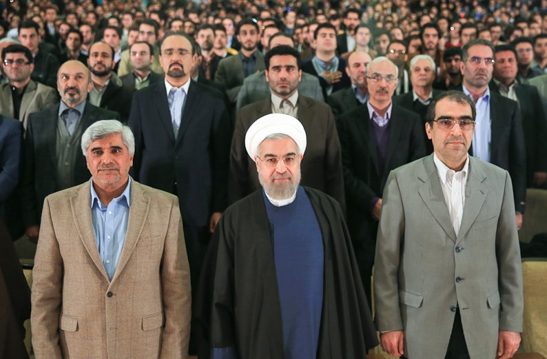 دانشجویان حاضر در مراسم در حین سخنرانی رئیس جمهور به دو دسته مخالف و موافق تقسیم شده بودند و شعارهایی سرمیدادند. دانشجویان شعار «روحانی، روحانی حمایتت میکنیم» سر دادند و «دکتر ظریف زنده باد، روحانی پاینده باد» از سوی دانشجویان سر داده شد.